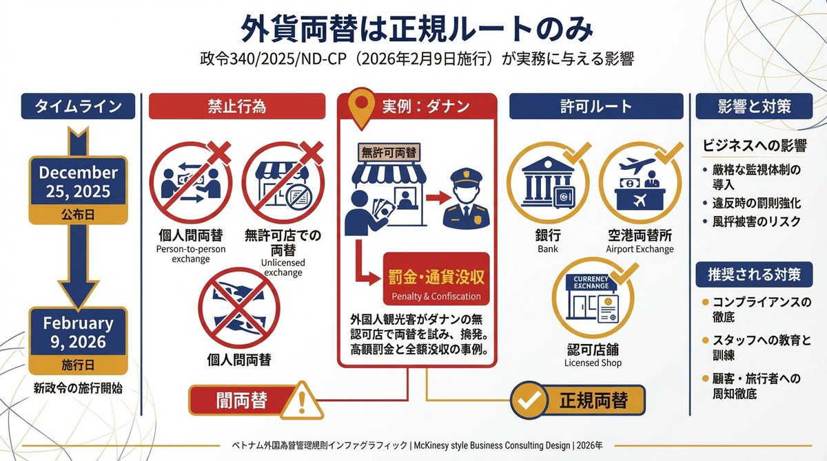 政令340/2025/NĐ-CP(2026年2月9日施行)は、外貨両替を「突然禁止」する類のものではありません。一方で、個人間両替や無許可店での両替に対して、罰金だけでなく没収まで含めて執行しやすい法体系となり、既にダナン市公安のように具体的な摘発事例も存在します。