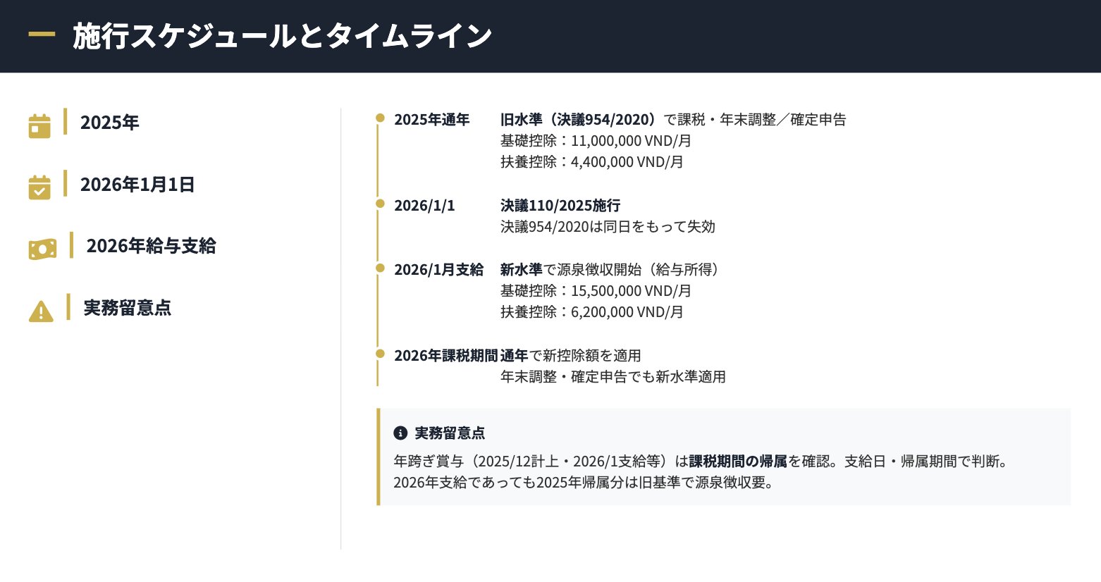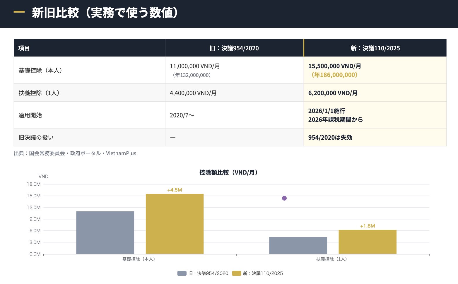 | 基礎控除(本人) | 11,000,000 VND/月(132,000,000/年) | 15,500,000 VND/月(186,000,000/年) |